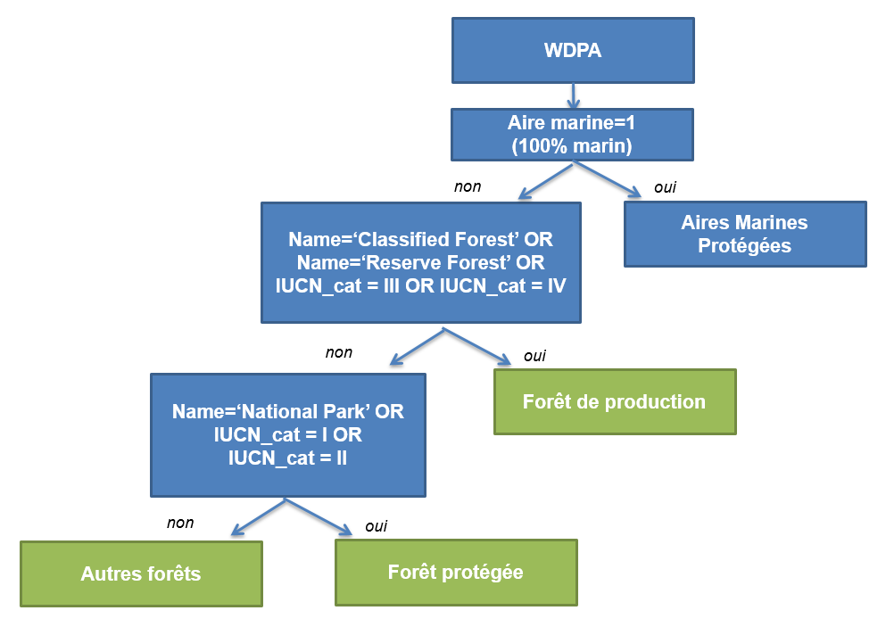 Figure 3 : Arbre de décision pour la catégorisation des trois types de forêts utilisés dans le Land-use Planner Spatial. Les informations de la base de données WDPA sont utilisées pour filtrer et étiqueter la typologie (carré vert) tel que présenté dans les carrés bleus. À noter que le premier critère implique d’écarter seulement les aires marines entièrement situées sur des zones marines et de conserver celles qui sont entièrement ou en partie sur des zones terrestres.