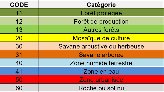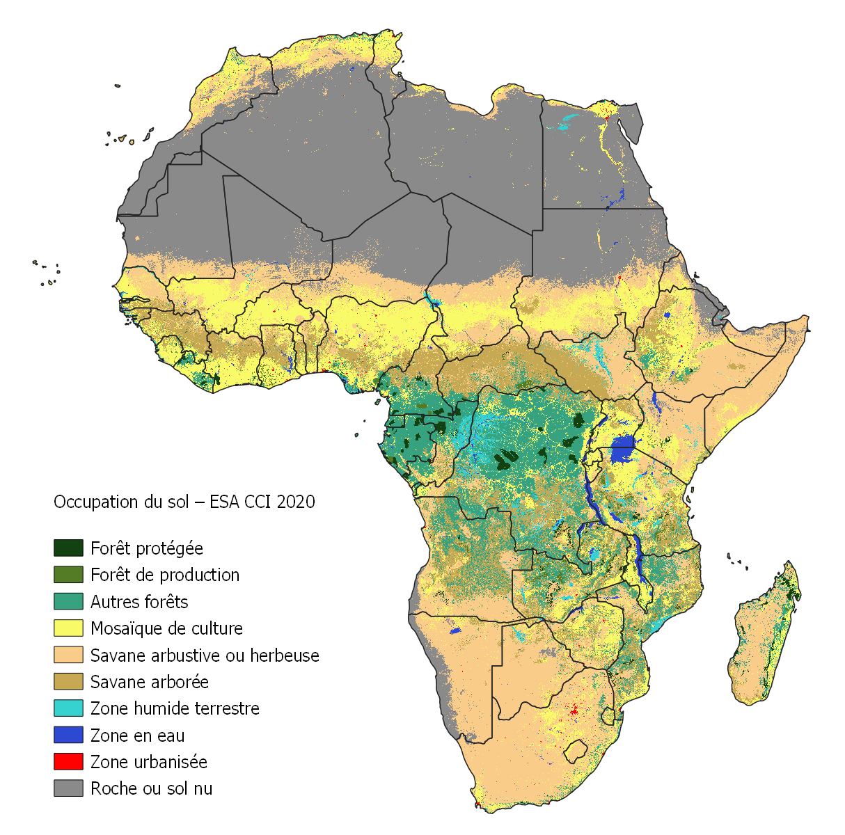La carte d’occupation des sols utilisée est celle produite pour l’Agence Spatiale Européenne (ESA produit LC CCI) pour l’année 2020. Cette carte propose une cartographie mondiale de l’occupation des sols en 38 catégories, à 300 mètres de résolution, et actualisée chaque année depuis 2005. Toutes les catégories ne sont pas présentes sur le territoire africain. Pour plus de clarté et faire le lien avec la typologie du Groupe d'experts intergouvernemental sur l'évolution du climat, cette légende a été simplifiée en sept catégories dans un premier temps, sur la base de typologie de l’ESA, puis en 10 catégories, après intégration des statuts fonciers forestiers ( cf. identification des statuts fonciers ).