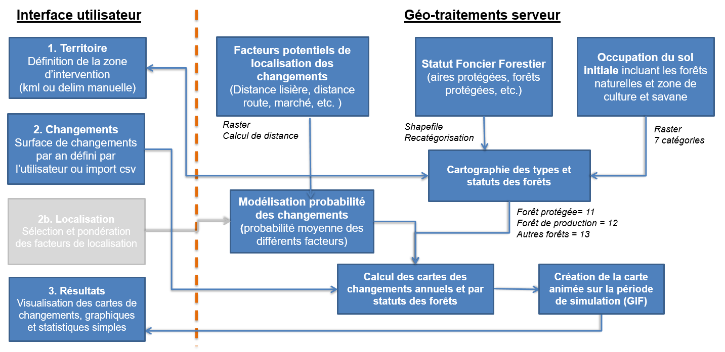 L’objectif de cette première phase de développement (version prototype) est de démontrer la faisabilité de la cartographie dynamique de la déforestation à l'échelle du continent africain à partir des résultats du Land-use Planner. Une future phase de développement de ce module pourra visualiser la restauration des paysages forestiers, permettre de modifier les facteurs de changements, et couvrir d’autres continents et d’autres facteurs de conversion. Pour cette première phase, certains choix techniques ont été faits :