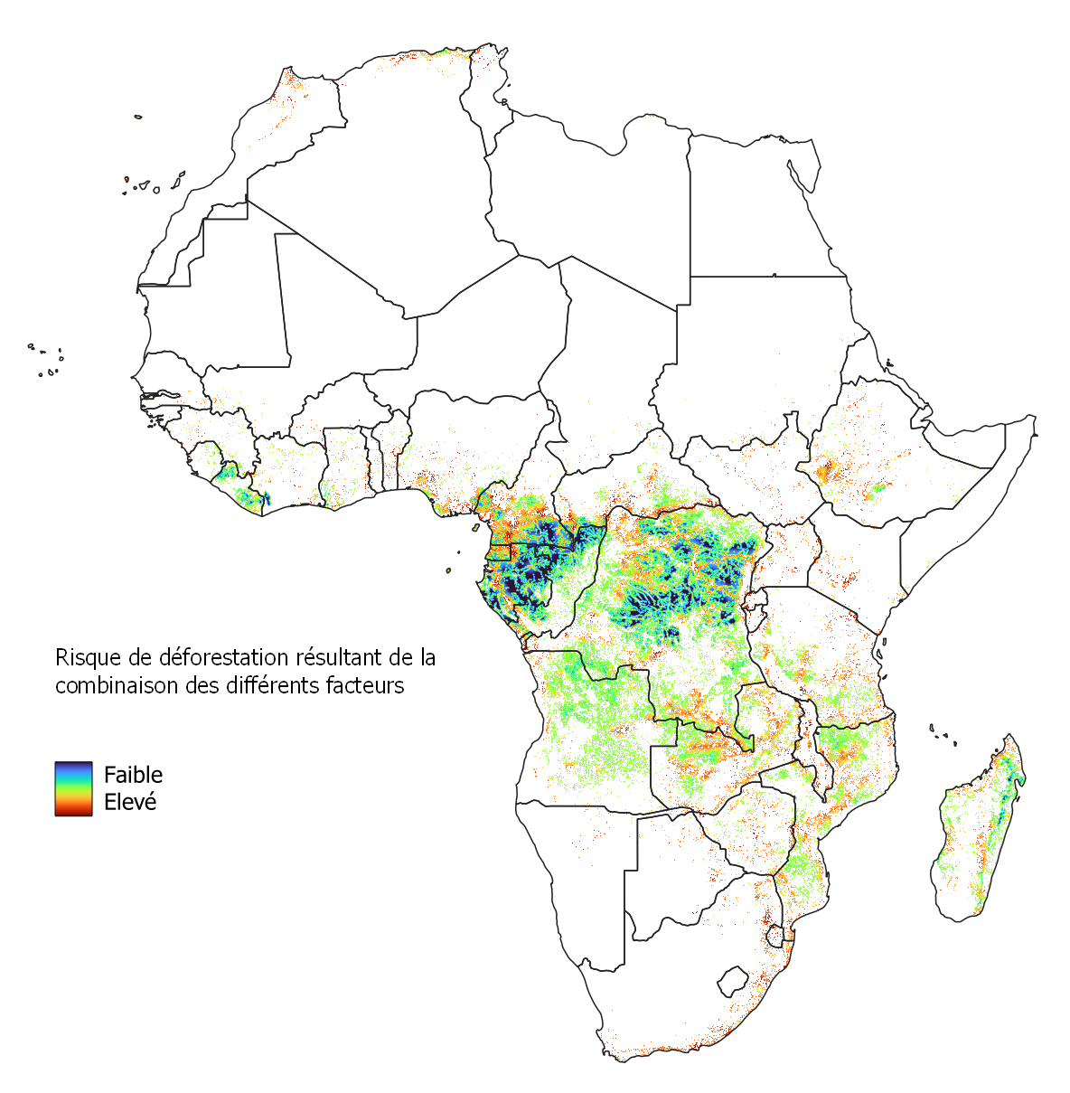 Figure 5 : Illustration de la carte de risque de déforestation croisant les facteurs de distance à la lisière, aux infrastructures routières, et aux grands marchés agricoles. Les zones en rouge sont les zones avec le risque le plus fort. Les zones jaunes et bleues, localisées loin des routes et des villes et/ou à l’intérieur des massifs forestiers, ont moins de risque d’être défrichées