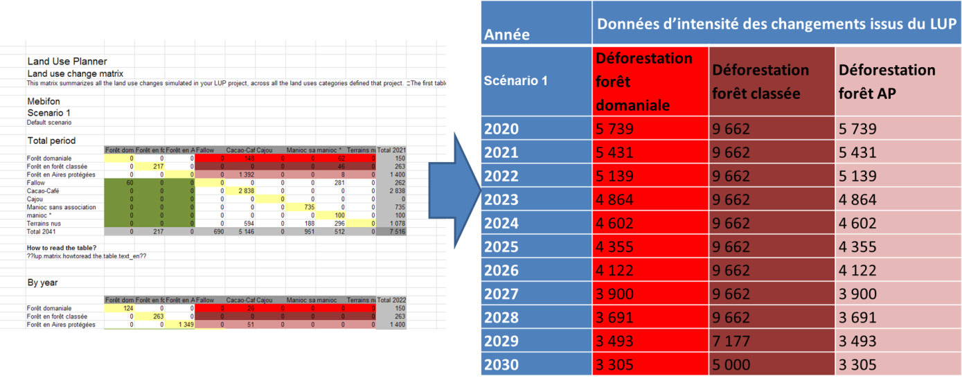 Les informations sur les changements d’usage des terres et la déforestation proviennent des résultats du Land-use Planner et doivent être intégrés à cette étape. Dans votre projet Land-use Planner, choisissez le scénario qui vous intéresse pour cartographier les dynamiques de déforestation avec le Land-use Planner Spatial. Vous trouverez les informations utiles dans le tableau de résultats de la Matrice Land-use Planner (« Raw_matrix.xls ») qui résume les surfaces de conversion d’usages des terres par année pour un scénario donné. L’intégration de ces résultats du Land-use Planner dans le Land-use Planner Spatial peut se faire en chargeant un tableau synthétisant uniquement les conversions de déforestation par année et pour chacun des trois types de forêt du Land-use Planner Spatial : forêt protégée, forêt de production et autres forêts. L’utilisateur peut aussi définir manuellement chaque valeur de surfaces (en hectares) dans le Land-use Planner Spatial, en entrant les valeurs correspondantes dans le tableau à droite. Le travail sous-jacent d’intégration des données du Land-use Planner dans le tableau Land-use Planner Spatial de changements est résumé ci-dessous.