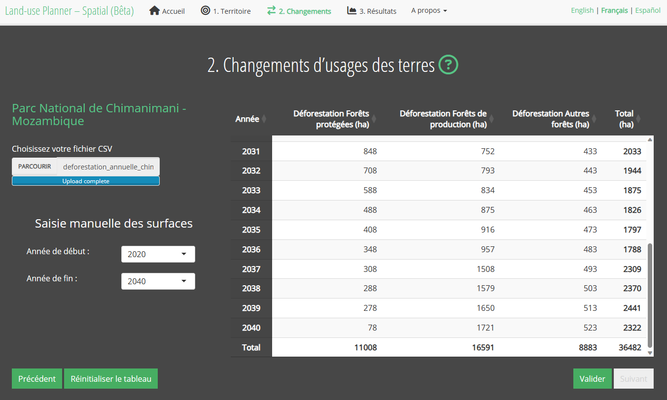 Les résultats sont calculés à partir (1) de la carte d’occupation des sols intégrant le statut foncier des forêts, (2) de votre tableau de changements, et (3) de la carte de probabilité des changements. Les changements annuels sont retranchés des surfaces initiales de chaque type de forêt en prenant les pixels ayant les plus fortes probabilités d’être convertis, selon la carte de probabilité de changements fondée sur les trois facteurs précités. Les surfaces converties correspondent exactement aux surfaces dans le tableau des changements indiquées par l’utilisateur sauf lorsque les surfaces de forêts sont insuffisantes – type(s) de forêt entièrement disparu(s).