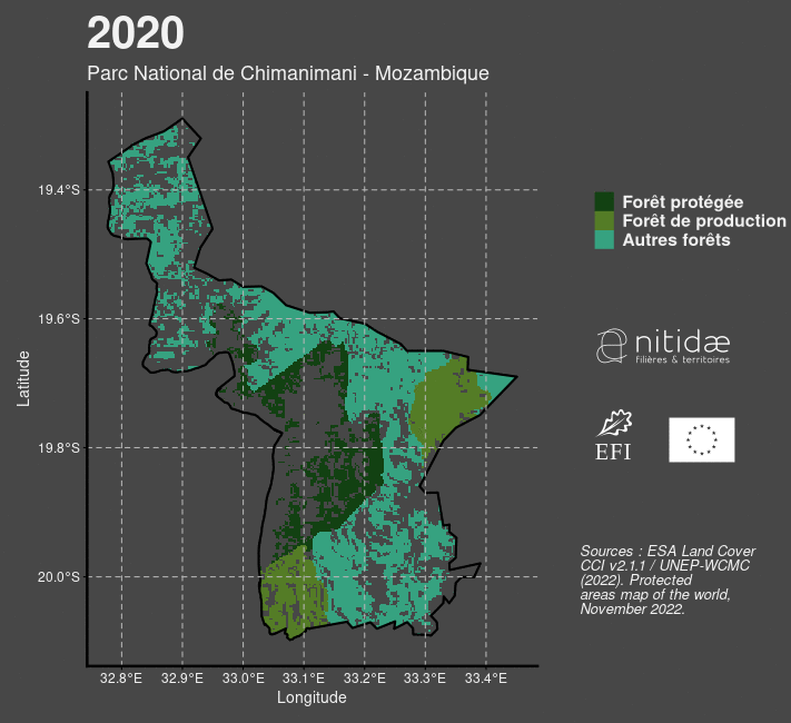 Figure 2 : Carte d’occupation des sols utilisée dans le Land-use Planner Spatial, recatégorisée à partir de la carte ESA, CCI 2020 et croisée avec les statuts fonciers issus de la base de données WDPA