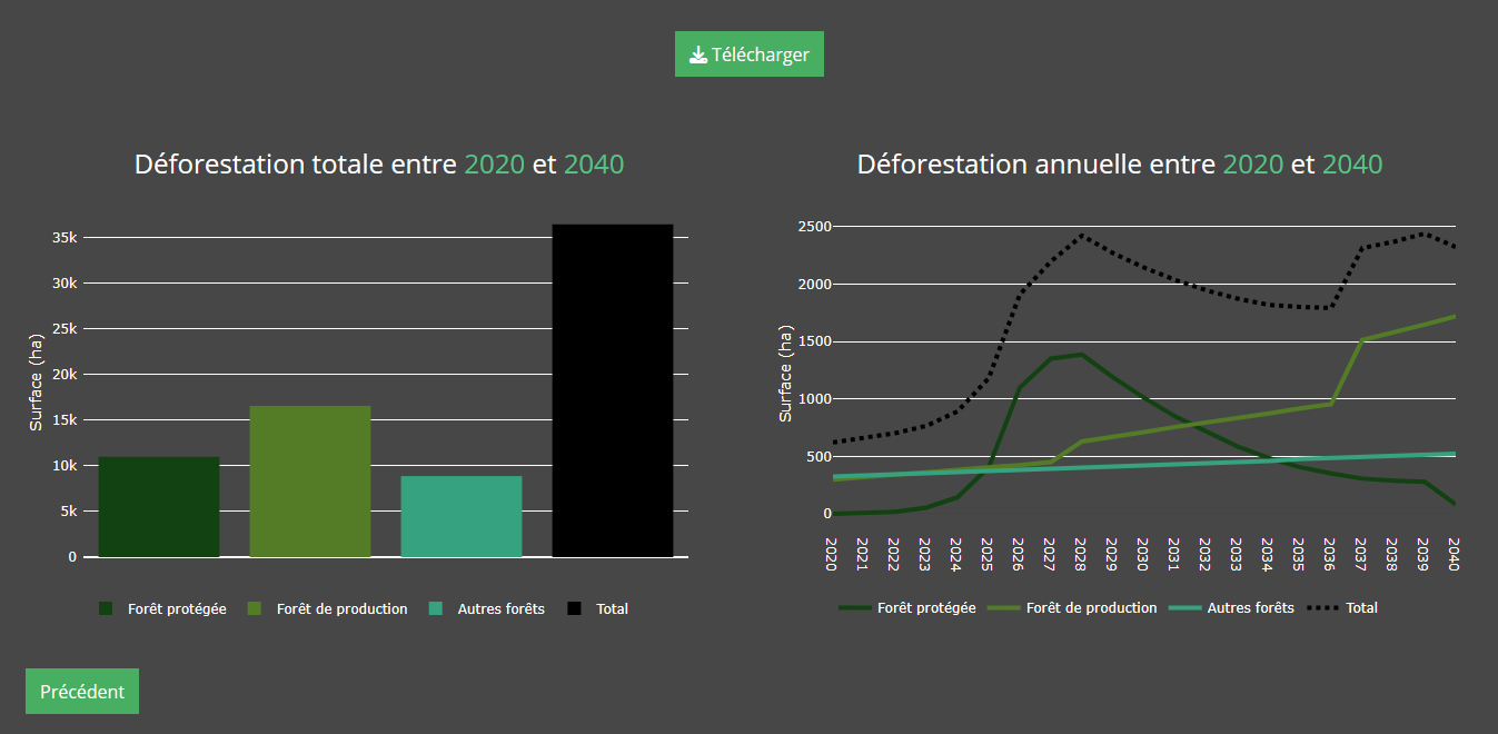 Le résultat principal est affiché sous la forme d’une carte animée montrant les surfaces de forêts perdues par année (GIF). Des graphiques complémentaires indiquent les surfaces annuelles défrichées et le cumul de ces surfaces par type de forêt sur la période de simulation.